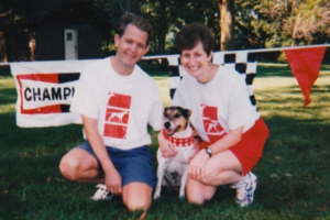 Long before online adoption sites existed, we discovered Duffy in the newspaper. He was “Pet of the Week” at Anderson Humane, listed as a “Lively Bull Terrier Mix.” That description barely captured his boundless energy and curious spirit. From the moment we met him at his Meet and Greet in South Elgin, we felt an instant and undeniable connection. He jumped into our hearts, and we knew he belonged with us.