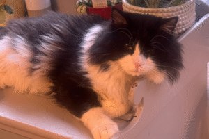 There were no orange cats that day. Instead, a staff member gently suggested we meet a long-haired black and white adult boy named Sir Frosty. She explained that he had recently been adopted and returned within just three days because he was described as too affectionate, too friendly, and too vocal.