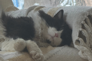 Sir Frosty was resting in a floor crate. When we opened the door, my husband sat down on the floor. Without hesitation, Sir Frosty stepped out, walked straight over, and climbed into his lap. It was one of those moments where nothing else needed to be said. We looked at each other and knew he was coming home with us.