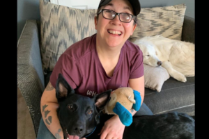 My sister introduced me to Anderson Humane when I was ready to open my home to a foster dog. I applied for two dogs, but I only brought one home. A few days later, on the way back from his neuter appointment, I fell down the stairs outside the shelter and fractured my foot. I was in a walking boot for a couple of months.