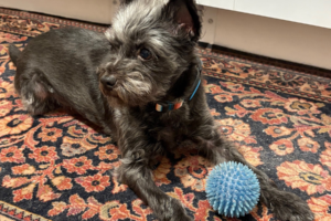 His resource guarding has improved so much. He no longer gets tense around food or toys. He now enjoys collaborative play, nudging a ball toward me or tossing a toy in my direction. Fetch has become one of his favorite games, especially with his blue spiky ball from Anderson Humane.