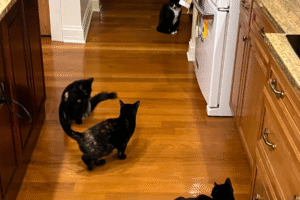 Buddy quickly integrated himself into the household. Squirt became his follower and friend, Cranberry allowed him a sniff before retreating with dignity, and Pepper accepted him while still demanding human attention. Together, the four have become a unique clowder, full of personality, affection, and the occasional mischief.