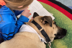 His favorite visits are the ones where children read to him. He listens with his whole body. Head tilted. Eyes soft. Tail gently thumping. As if every story is the most important thing he has ever heard.